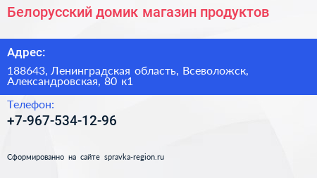 Белорусский домик, магазин продуктов по адресу 188643, Ленинградская область, Всеволожск, Александровская, 80 к1 в дальнейшем Организация, размещена в следующих категориях: