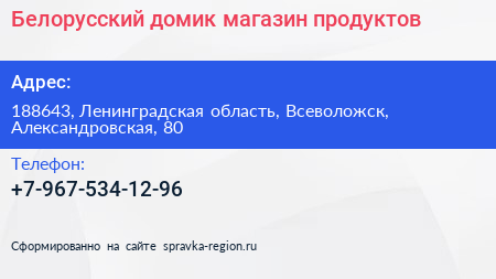 Белорусский домик, магазин продуктов по адресу 188643, Ленинградская область, Всеволожск, Александровская, 80 в дальнейшем Организация, размещена в следующих категориях: