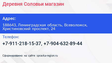 Деревня Соловьи, магазин по адресу 188643, Ленинградская область, Всеволожск, Христиновский проспект, 24 в дальнейшем Организация, размещена в следующих категориях: