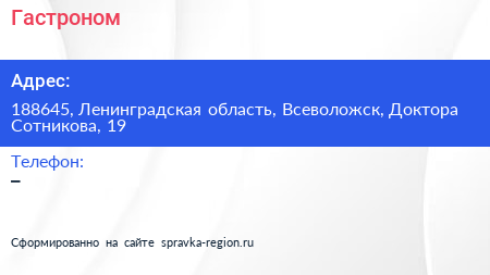 Гастроном по адресу 188645, Ленинградская область, Всеволожск, Доктора Сотникова, 19 в дальнейшем Организация, размещена в следующих категориях: