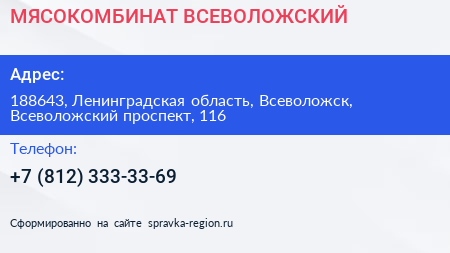 МЯСОКОМБИНАТ ВСЕВОЛОЖСКИЙ по адресу 188643, Ленинградская область, Всеволожск, Всеволожский проспект, 116 в дальнейшем Организация, размещена в следующих категориях: