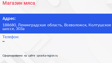 Магазин мяса по адресу 188680, Ленинградская область, Всеволожск, Колтушское шоссе, 303а в дальнейшем Организация, размещена в следующих категориях: