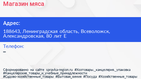Магазин мяса по адресу 188643, Ленинградская область, Всеволожск, Александровская, 80 лит Е в дальнейшем Организация, размещена в следующих категориях: