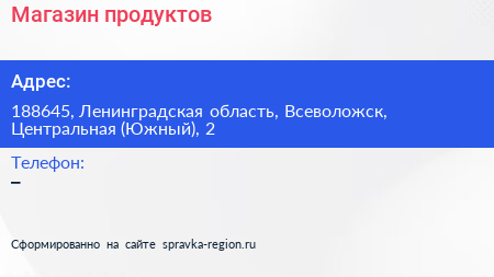 Магазин продуктов по адресу 188645, Ленинградская область, Всеволожск, Центральная (Южный), 2 в дальнейшем Организация, размещена в следующих категориях: