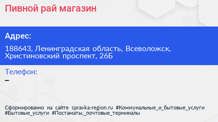 Пивной рай, магазин по адресу 188643, Ленинградская область, Всеволожск, Христиновский проспект, 26Б в дальнейшем Организация, размещена в следующих категориях: