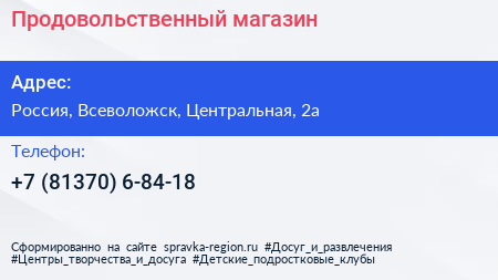 Продовольственный магазин по адресу Продукты, 2А, Лесная улица, Плинтовка, Щегловское сельское поселение, Всеволожский район, Ленинградская область, Северо-Западный федеральный округ, 188676, Россия в дальнейшем Организация, размещена в следующих категориях: