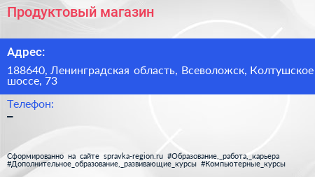 Продуктовый магазин по адресу 188640, Ленинградская область, Всеволожск, Колтушское шоссе, 73 в дальнейшем Организация, размещена в следующих категориях: