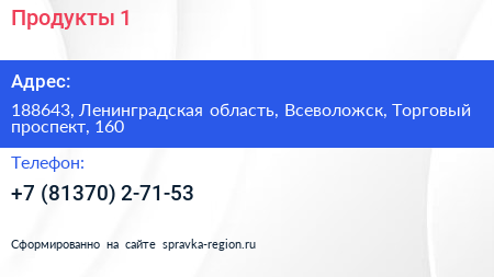 Продукты №1 по адресу 188643, Ленинградская область, Всеволожск, Торговый проспект, 160 в дальнейшем Организация, размещена в следующих категориях: