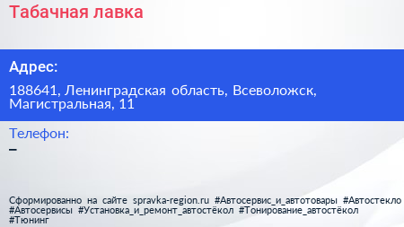 Табачная лавка по адресу 188641, Ленинградская область, Всеволожск, Магистральная, 11 в дальнейшем Организация, размещена в следующих категориях: