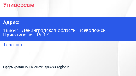 Универсам по адресу 188641, Ленинградская область, Всеволожск, Приютинская, 15-17 в дальнейшем Организация, размещена в следующих категориях: