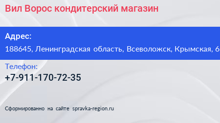 Вил-Ворос, кондитерский магазин по адресу 188645, Ленинградская область, Всеволожск, Крымская, 6 в дальнейшем Организация, размещена в следующих категориях: