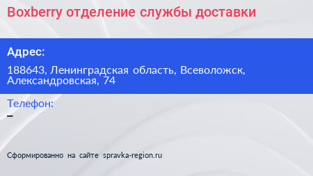Boxberry, отделение службы доставки по адресу 188643, Ленинградская область, Всеволожск, Александровская, 74 в дальнейшем Организация, размещена в следующих категориях:
