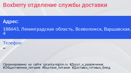 Boxberry, отделение службы доставки по адресу 188643, Ленинградская область, Всеволожск, Варшавская, 4 в дальнейшем Организация, размещена в следующих категориях: