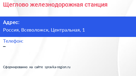 Щеглово, железнодорожная станция по адресу 1 с1, Линейная улица, Плинтовка, Щегловское сельское поселение, Всеволожский район, Ленинградская область, Северо-Западный федеральный округ, 188676, Россия в дальнейшем Организация, размещена в следующих категориях: