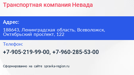 Транспортная компания Невада по адресу 188643, Ленинградская область, Всеволожск, Октябрьский проспект, 122 в дальнейшем Организация, размещена в следующих категориях: