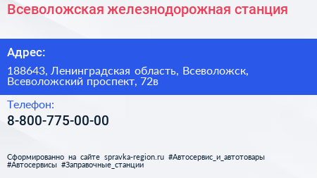 Всеволожская, железнодорожная станция по адресу 188643, Ленинградская область, Всеволожск, Всеволожский проспект, 72в в дальнейшем Организация, размещена в следующих категориях: