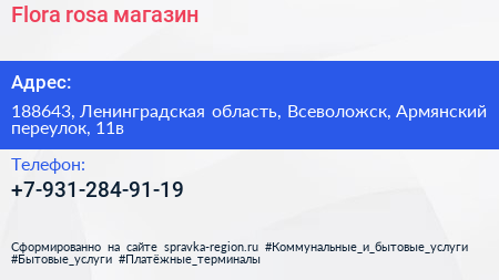 Flora rosa, магазин по адресу 188643, Ленинградская область, Всеволожск, Армянский переулок, 11в в дальнейшем Организация, размещена в следующих категориях: