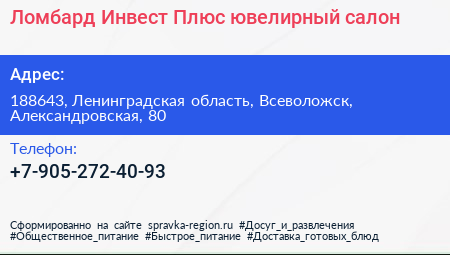Ломбард Инвест Плюс, ювелирный салон по адресу 188643, Ленинградская область, Всеволожск, Александровская, 80 в дальнейшем Организация, размещена в следующих категориях: