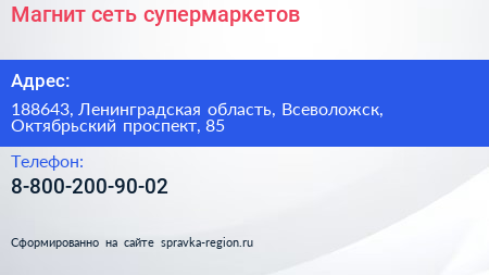 Магнит, сеть супермаркетов по адресу 188643, Ленинградская область, Всеволожск, Октябрьский проспект, 85 в дальнейшем Организация, размещена в следующих категориях: