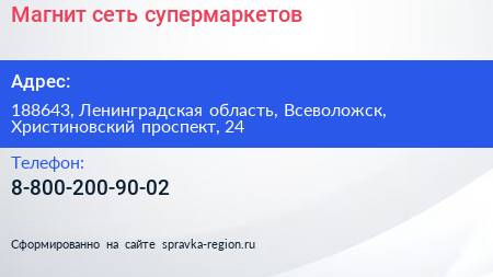 Магнит, сеть супермаркетов по адресу 188643, Ленинградская область, Всеволожск, Христиновский проспект, 24 в дальнейшем Организация, размещена в следующих категориях: