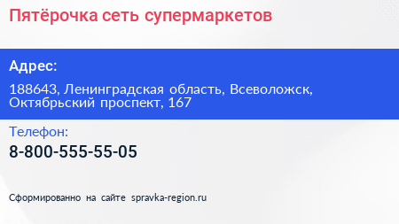 Пятёрочка, сеть супермаркетов по адресу 188643, Ленинградская область, Всеволожск, Октябрьский проспект, 167 в дальнейшем Организация, размещена в следующих категориях: