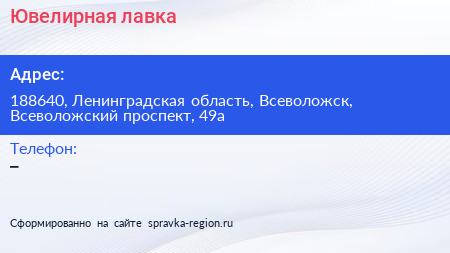 Ювелирная лавка по адресу 188640, Ленинградская область, Всеволожск, Всеволожский проспект, 49а в дальнейшем Организация, размещена в следующих категориях: