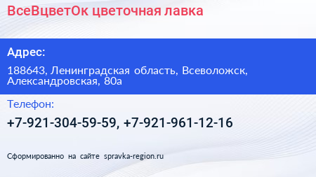 ВсеВцветОк, цветочная лавка по адресу 188643, Ленинградская область, Всеволожск, Александровская, 80а в дальнейшем Организация, размещена в следующих категориях: