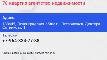 78 квартир, агентство недвижимости по адресу 188645, Ленинградская область, Всеволожск, Доктора Сотникова, 1 в дальнейшем Организация, размещена в следующих категориях: