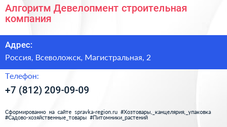 Алгоритм Девелопмент, строительная компания по адресу Svetlana, 2, Магистральная улица, Щеглово, Щегловское сельское поселение, Всеволожский район, Ленинградская область, Северо-Западный федеральный округ, 188676, Россия в дальнейшем Организация, размещена в следующих категориях: