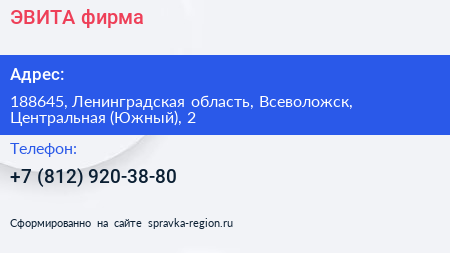 ЭВИТА, фирма по адресу 188645, Ленинградская область, Всеволожск, Центральная (Южный), 2 в дальнейшем Организация, размещена в следующих категориях: