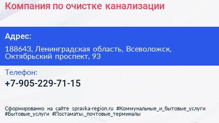 Компания по очистке канализации по адресу 188643, Ленинградская область, Всеволожск, Октябрьский проспект, 93 в дальнейшем Организация, размещена в следующих категориях: