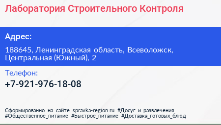 Лаборатория Строительного Контроля по адресу 188645, Ленинградская область, Всеволожск, Центральная (Южный), 2 в дальнейшем Организация, размещена в следующих категориях: