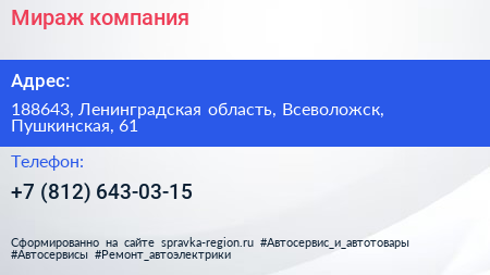 Мираж, компания по адресу 188643, Ленинградская область, Всеволожск, Пушкинская, 61 в дальнейшем Организация, размещена в следующих категориях: