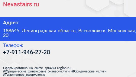 Nevastairs.ru по адресу 188645, Ленинградская область, Всеволожск, Московская, 20 в дальнейшем Организация, размещена в следующих категориях: