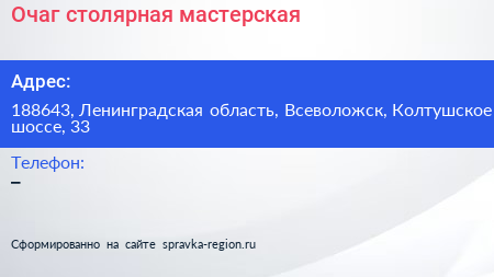 Очаг, столярная мастерская по адресу 188643, Ленинградская область, Всеволожск, Колтушское шоссе, 33 в дальнейшем Организация, размещена в следующих категориях: