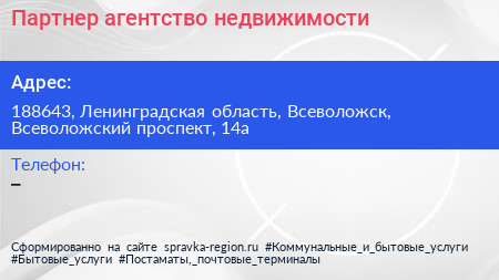 Партнер, агентство недвижимости по адресу 188643, Ленинградская область, Всеволожск, Всеволожский проспект, 14а в дальнейшем Организация, размещена в следующих категориях: