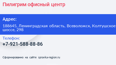 Пилигрим, офисный центр по адресу 188645, Ленинградская область, Всеволожск, Колтушское шоссе, 298 в дальнейшем Организация, размещена в следующих категориях: