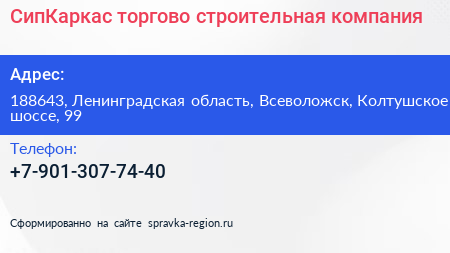СипКаркас, торгово-строительная компания по адресу 188643, Ленинградская область, Всеволожск, Колтушское шоссе, 99 в дальнейшем Организация, размещена в следующих категориях: