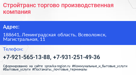Стройтранс, торгово-производственная компания по адресу 188641, Ленинградская область, Всеволожск, Магистральная, 11 в дальнейшем Организация, размещена в следующих категориях: