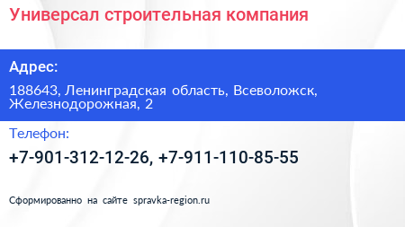 Универсал, строительная компания по адресу 188643, Ленинградская область, Всеволожск, Железнодорожная, 2 в дальнейшем Организация, размещена в следующих категориях: