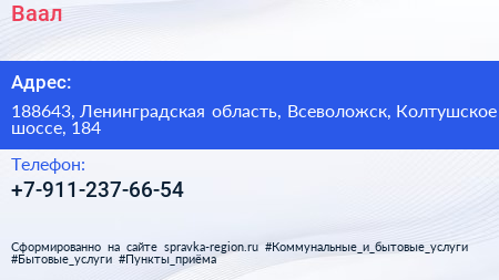 Ваал по адресу 188643, Ленинградская область, Всеволожск, Колтушское шоссе, 184 в дальнейшем Организация, размещена в следующих категориях: