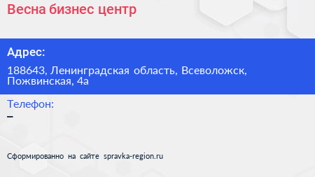 Весна, бизнес-центр по адресу 188643, Ленинградская область, Всеволожск, Пожвинская, 4а в дальнейшем Организация, размещена в следующих категориях: