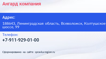 Ангард, компания по адресу 188643, Ленинградская область, Всеволожск, Колтушское шоссе, 99 в дальнейшем Организация, размещена в следующих категориях: