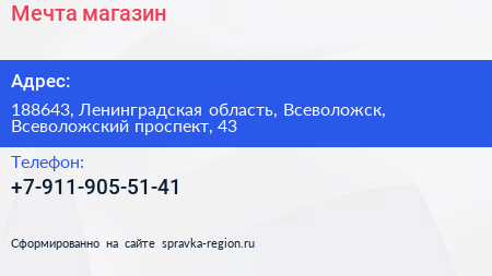 Мечта, магазин по адресу 188643, Ленинградская область, Всеволожск, Всеволожский проспект, 43 в дальнейшем Организация, размещена в следующих категориях: