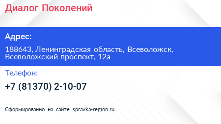 Диалог Поколений по адресу 188643, Ленинградская область, Всеволожск, Всеволожский проспект, 12а в дальнейшем Организация, размещена в следующих категориях: