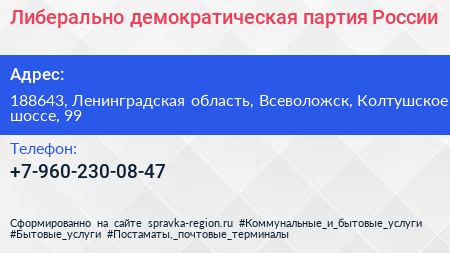 Либерально-демократическая партия России по адресу 188643, Ленинградская область, Всеволожск, Колтушское шоссе, 99 в дальнейшем Организация, размещена в следующих категориях: