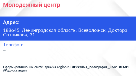 Молодежный центр по адресу 188645, Ленинградская область, Всеволожск, Доктора Сотникова, 31 в дальнейшем Организация, размещена в следующих категориях: