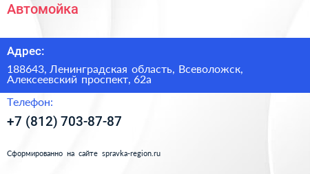 Автомойка по адресу 188643, Ленинградская область, Всеволожск, Алексеевский проспект, 62а в дальнейшем Организация, размещена в следующих категориях: