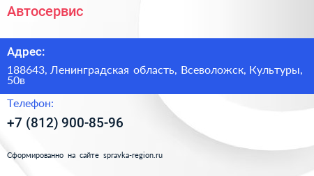 Автосервис по адресу 188643, Ленинградская область, Всеволожск, Культуры, 50в в дальнейшем Организация, размещена в следующих категориях: