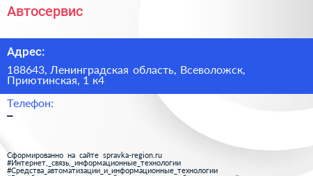 Автосервис по адресу 188643, Ленинградская область, Всеволожск, Приютинская, 1 к4 в дальнейшем Организация, размещена в следующих категориях: